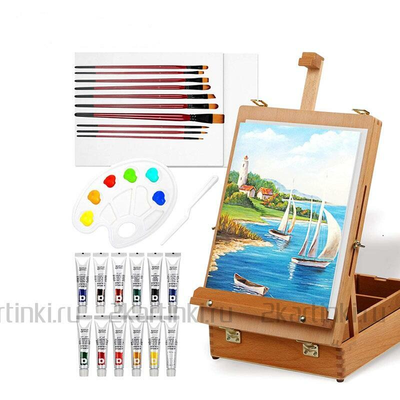 Мольберт «Набор подарочный «Две картинки» 27 предметов: этюдник 35 см из бука, краски акрил 12x12 мл, 2 холста 22x30 на мдф, 10 кистей, мастихин, палитра» размером см. купить по выгодной цене 3 791 ₽ с доставкой по Москве и всей России.